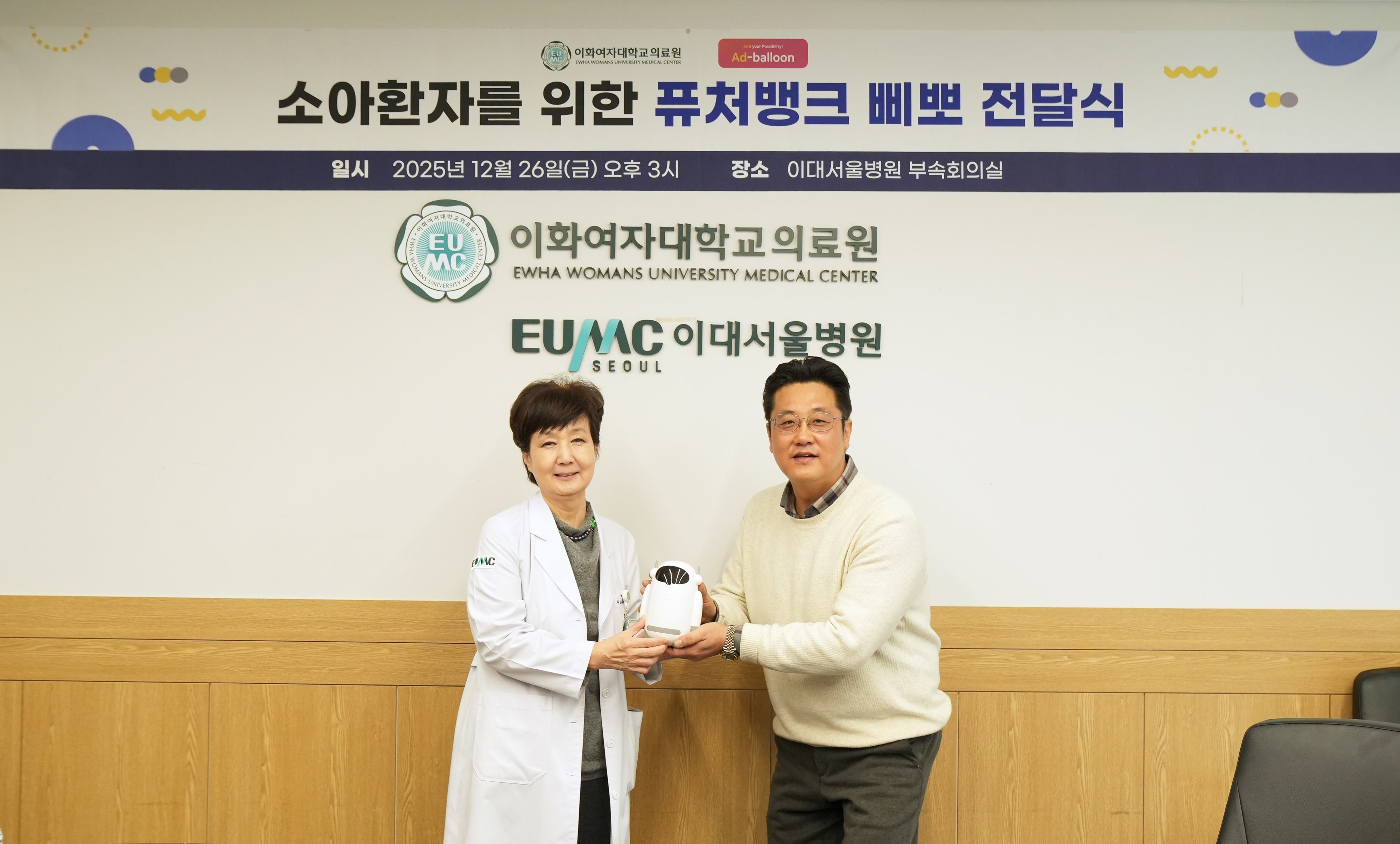 이화여자대학교 의료원(의료원장 유경하)은 지난 26일 이대서울병원 7층 부속회의실에서 ㈜애드벌룬(대표 김관석, 김동현)과 ‘소아환자를 위한 퓨처뱅크삐뽀 전달식’을 개최했다.