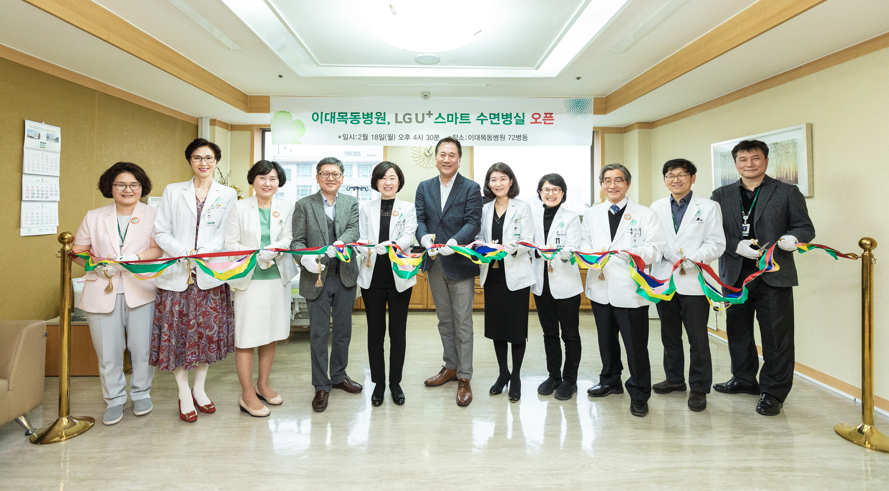 2월 18일 이대목동병원 7층 VIP 병실과 8층 수면다원검사실에서 개최된 ‘스마트 수면병실’ 오픈 기념식에는 문병인 이화여자대학교 의료원장, 한종인 이대목동병원장, 이선영 이대목동병원 진료부장, 하은희 이화융합의료원장, 이향운 수면센터장 등 의료원 관계자들과 LG U+ AIoT 부문 현준용 전무, 기업신사업그룹 조원석 상무 등 LG U+ 관계자 20여 명이 참석했다.