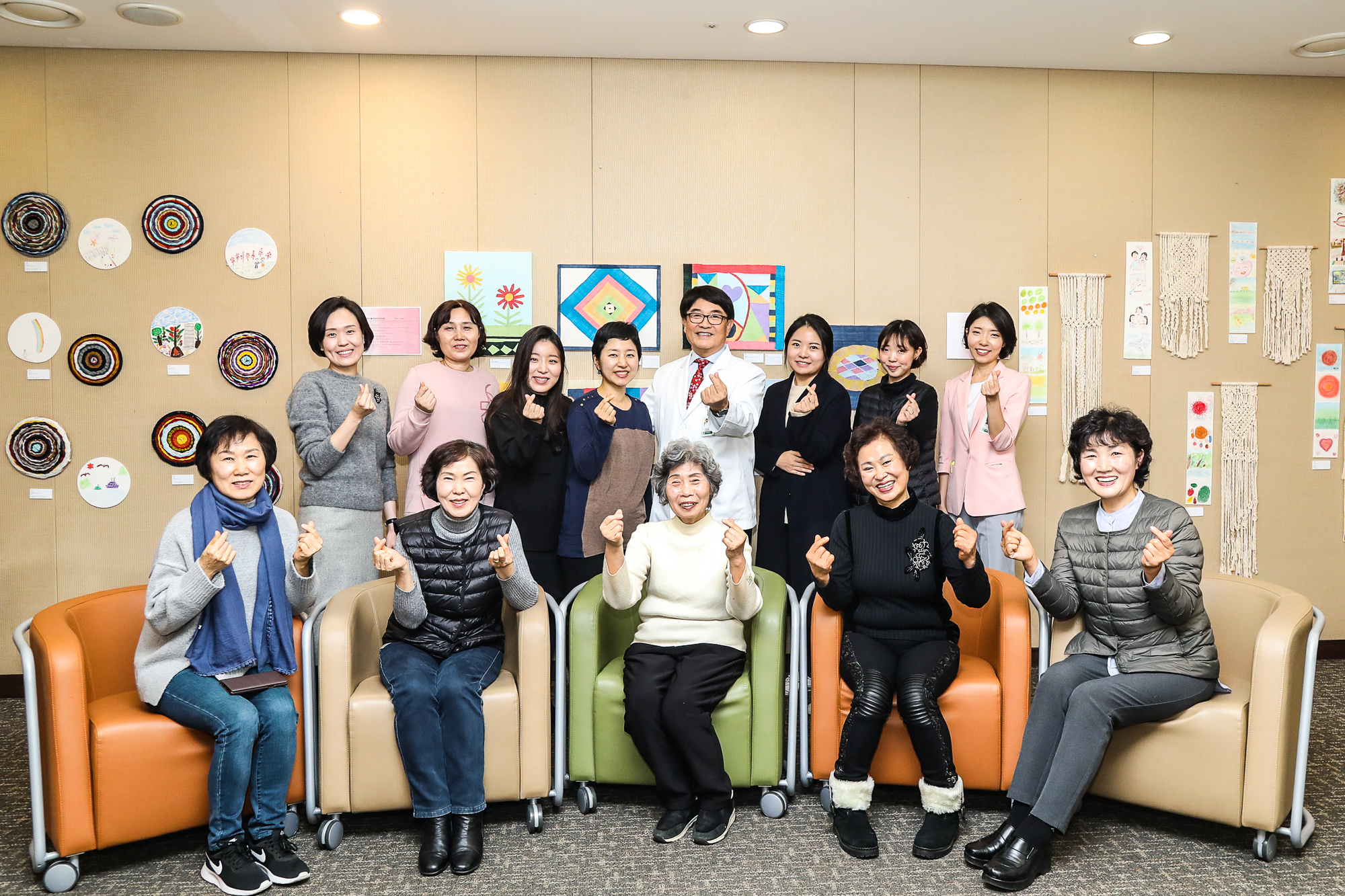 ▲ 지난 12월 3일 이대여성암병원 다목적실에서 있은 ‘메이킹 마이 리틀 포레스트(Making My Little Forest)’ 전시회에서 참여한 환우들과 봉사자 백남선 이대여성암병원장이 기념 촬영을 하고 있다.