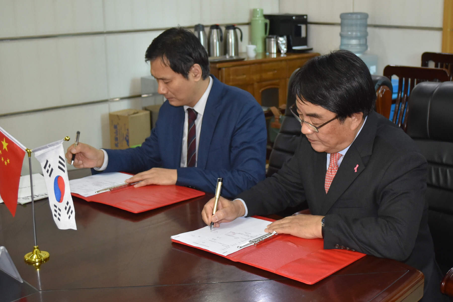 ▲ 백남선 이대여성암병원장(사진 오른쪽)과 뤄제 쓰옌시 타이허 병원장(사진 왼쪽)이 교류협력 협약서에 서명하고 있다.